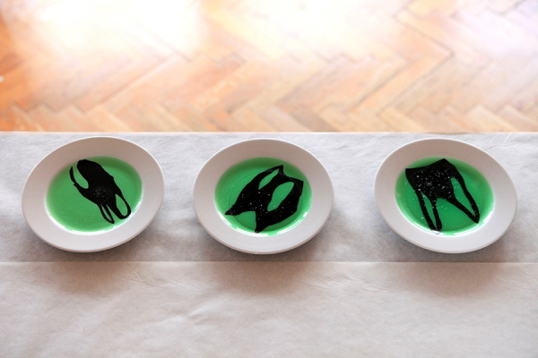 Schnittchen in Grün, 2013 Papierschnitt, Götterspeise, Porzellanteller